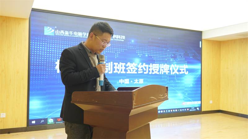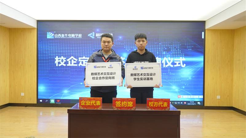 为深化校企合作培养模式,打造可持续发展的校园人才链,充分发挥企业与学校的双方优势为社会及企业服务的功能,更好的为社会、为企业培养高素质、高技能的应用型复合型人才,同时也为学生实习、实训、就业提供更多空间,在双方共同努力下,山西新宇科技发展有限公司和山西新华电脑学校共同签署了校企合作协议,同时进行了 “数媒艺术交互设计学生实训基地”和“数媒艺术交互设计校企对接班”的授牌仪式。