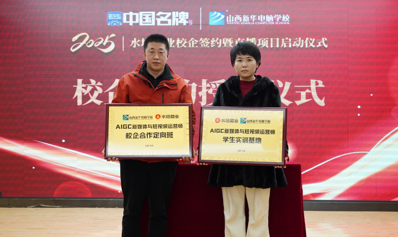 在热烈的掌声中,校企签约授牌仪式正式举行。山西新华电脑学校与水塔醋业的代表分别在合作协议上签字,并进行了授牌仪式。这一庄重的时刻,标志着双方在产教融合、人才培养和就业保障领域迈出了重要一步,为双方的合作奠定了坚实的基础。