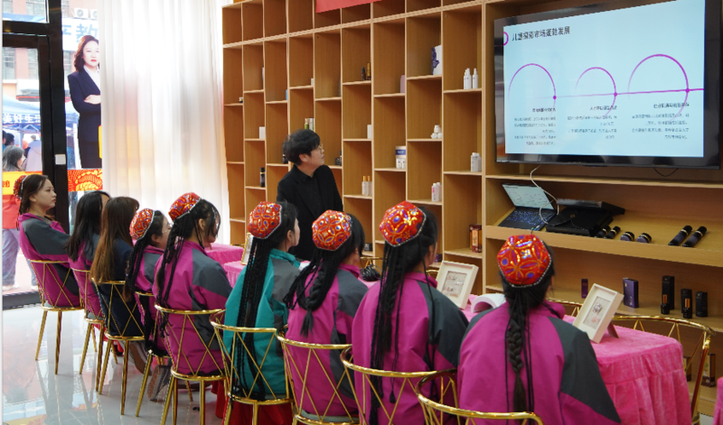 宣讲会上,美悦雅韵刘总通过精彩的 PPT 展示、生动的视频资料以及现场互动,全方位地介绍了企业的发展历程、业务范围、行业现状、职业发展计划等等。在岗位介绍环节,企业代表详细阐述了各个岗位的职责与发展前景。这些岗位不仅与幼师形象专业高度契合,还为毕业生提供了广阔的职业上升空间。