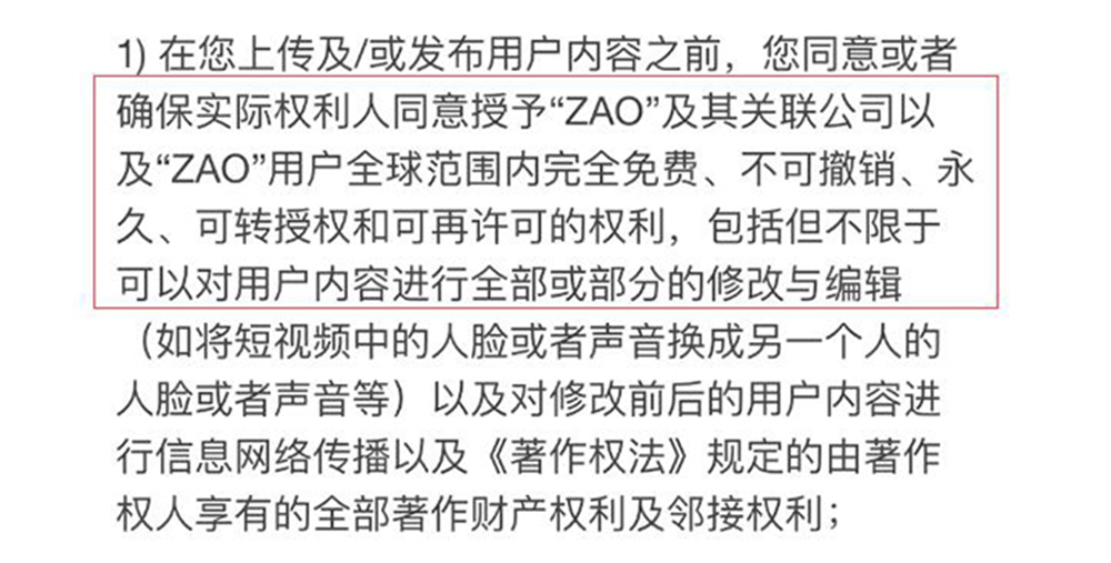根据ZAO用户协议内容中的必要授权协议:用户上传发布内容后,意味着同意授予ZAO及其关联公司以及ZAO用户在“全球范围内完全免费、不可撤销、永久、可转授权和可再许可的权利”,“包括但不限于可以对用户内容进行全部或部分的修改与编辑(如将短视频中的人脸或者声音换成另一个人的人脸或者声音等)以及对修改前后的用户内容进行信息网络传播以及《著作权法》规定的由著作权人享有的全部著作财产权利及邻接权利”。