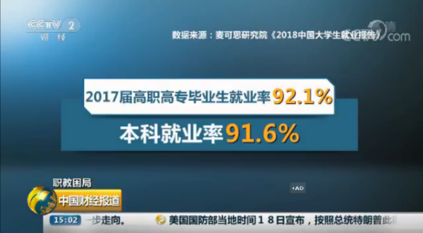 6月19日,CCTV2《中国财经报道》播出的《高职高专毕业生就业数据大盘点》专题节目中指出,2017届高职高专毕业生就业率为92.1%,本科就业率为91.6%,高职高专就业率首次超过本科。