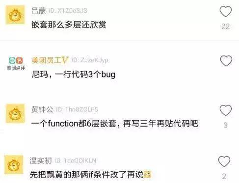 有网友看得非常仔细,一个Function方法中,竟然嵌套了6层的标签,而这已经超过了默认的了,会影响加载之类的,可见这是一位技术并不成熟的程序员,而这一行代码三个Bug的这条评论无疑很好得证明了这一点。