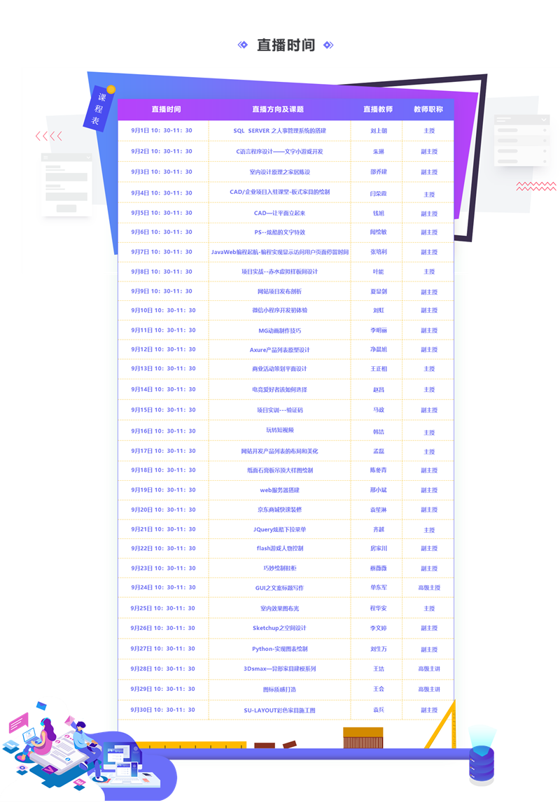 新华互联网科技为了帮助莘莘学子提升技能,2020年9月份,新华互联网科技将开展“匠师精技专题系列直播课”,来自全国各院校的30位主授、副主授共同参与,每天10:30-11:30在“新华云课堂”平台准时直播,为大家带来“PS--炫酷的文字特效”“JavaWeb编程起航”“MG动画制作技巧”等互联网专业课程,让广大学子足不出户,就能学到新华互联网精品课程。