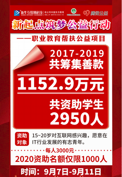 新华互联网科技自成立以来,不断投身公益事业,同时受到了社会各界爱心人士的广泛关注和支持。此项“新起点,筑梦公益行动”自2017年首次发起,截至2019年,已筹集超过1100万元的爱心捐赠,帮助2950名学生,2020年新华将资助1000名对互联网感兴趣的,愿意在IT行业发展的青年,致力让学生更好成才,拥有一个更加光明的未来。