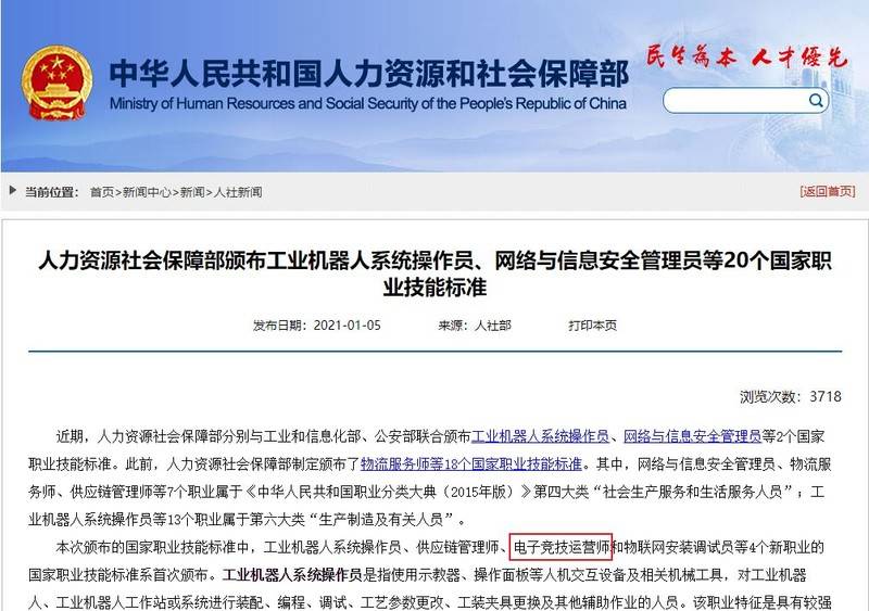 2019年4月人社部就发布通知,正式确认了电子竞技运营师成为新职业。现在规定了电子竞技运营师是指在电竞产业从事组织活动及内容运营的人员。该职业需具有良好的观察、理解、应变、人际沟通、组织、协调能力,较好的语言和文字表达及自主学习能力。人社部表示,这些颁布的国家职业技能标准,是开展职业教育培训和人才技能鉴定评价的基本依据,对促进相关领域从业人员素质提升、相关产业升级、行业发展将产生深远影响。
