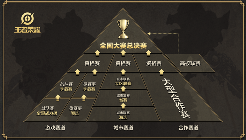 王者荣耀全国大赛属于大众赛事体系,代表了大众赛事的较高竞技水平。5人组队即可参与,面向每一个普通用户开放。较终的优胜队伍将有机会获得晋级职业联赛的评审资格。它并非高难度强竞技赛事,只要你年18周岁,无论性别、职业,也无论你身处何地,都可以报名参赛。在这里,每个人都有机会在王者荣耀全国大赛上书写关于自己的故事与传奇;在这里,所有怀揣电竞梦想的人都有一个平等的机会!都有机会进入“KGL王者荣耀甲级职业联赛(简称K甲)”开启自己的职业生涯!