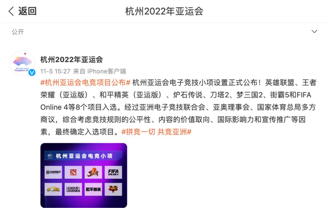 就在11月5日,杭州亚组委正式对外公布第19届亚运会电子竞技项目较终确认的八个小项项目,它们分别是《英雄联盟》、《王者荣耀亚运版本》、《和平精英亚运版本》、《FIFA Online 4》、《炉石传说》、《街霸 5》、《梦三国 2》与《DOTA 2》,同时,AESF-机甲大师和AESF-VR虚拟科技体育将作为示范表演项目进入杭州亚运会。