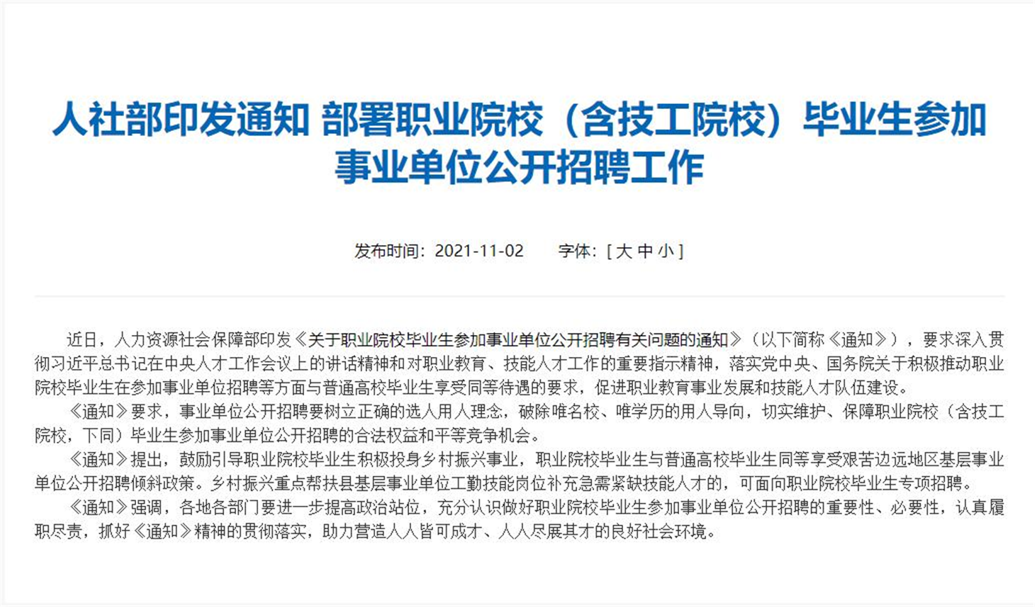 正是看到了传统学校教育的弊端,国家也在近年来大力倡导发展职业教育。近日人社部更是印发《关于职业院校毕业生参加事业单位公开招聘有关问题的通知》要求,事业单位公开招聘要树立正确的选人用人理念,破除唯名校、唯文凭的用人导向,切实维护、保障职业院校毕业生参加事业单位公开招聘的合法权益和平等竞争机会!,促进职业教育事业发展和技能人才队伍建设,助力营造人人皆可成才、人人尽展其才的良好社会环境。