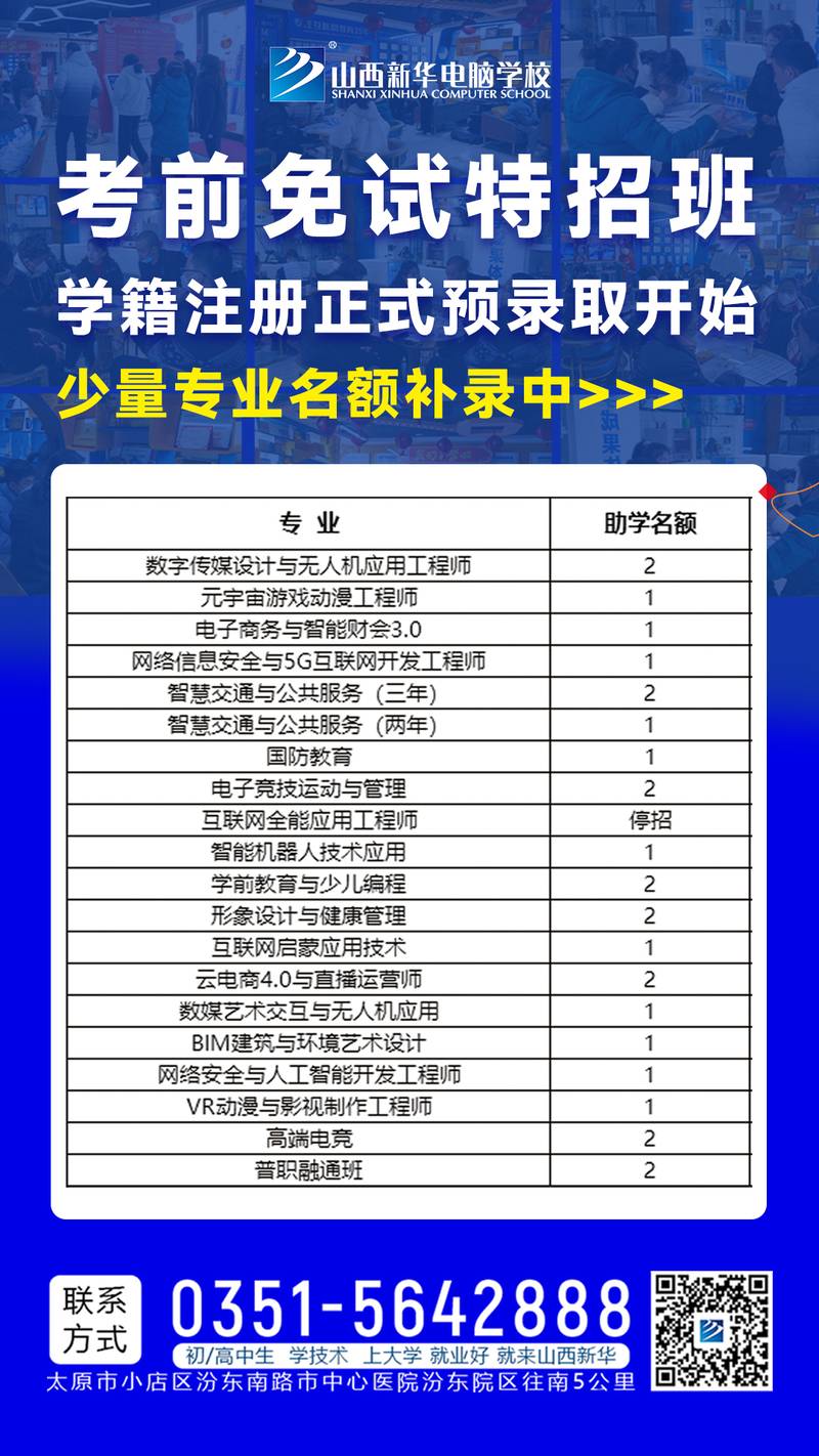 选职业教育,学专业技能!山西新华电脑学校夏秋季免试特招班补录通道限时开放中!现在报名不看分数即可入学!每天都有大量家长到校考察报名,所剩名额已经不多,请各位家长同学抓紧时间!把握较佳报名时机,来山西新华掌握一门实用的技能,规划一条升学之路,逆袭的人生从选择山西新华开始!