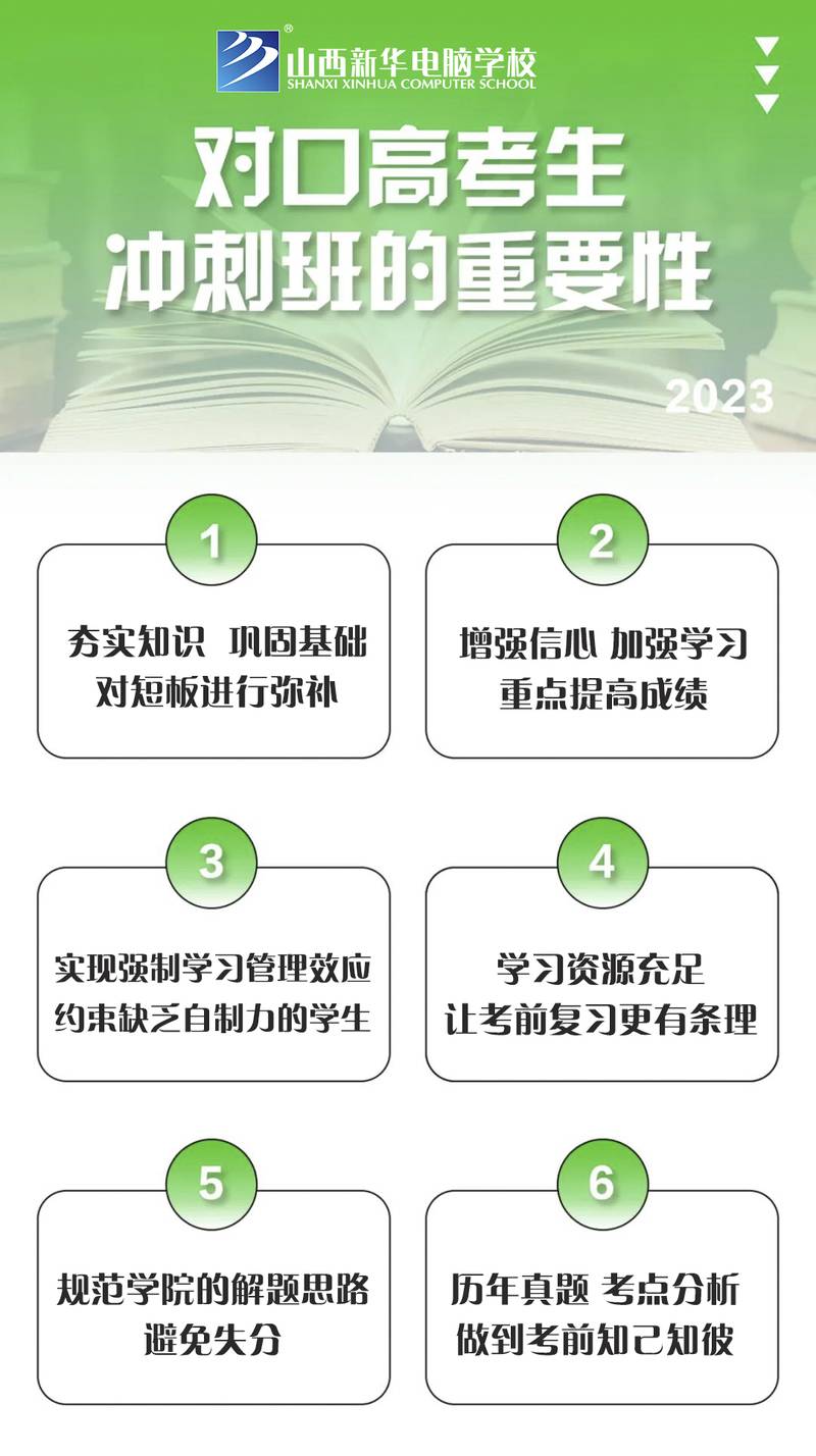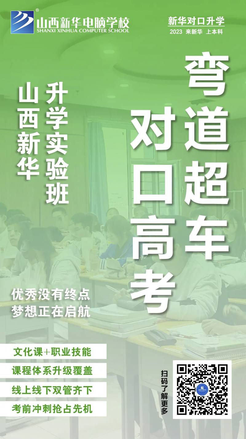 山西新华对口升学实验班,利用新华教育集团师资优势和教学特点,精心打造人才培养新模式,量身定制学生培养方案;升学、就业双向动态选择,挖掘学生较大提升发展潜力!真正让学生实现一个选择、两条出路、全程监测、动态调整,保障学生人尽其才,让想就业的同学实现高兴就业,让想升学的同学考入理想大学,对口升学可考取30多所省内二本以上院校,40余个对口相关专业,给你的人生上个双保险!
