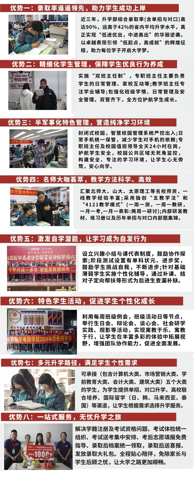 山西新华开设有技能升学班和单招升学班。新华升学项目部致力于高考升学的教学研发与培训,拥有专业的教师和教学管理团队,聘请省内高职院校一线教师参与教材、教学大纲研发,针对文化素质基础科目及职业技能科目学习及时更新,确保学生掌握考试核心知识点。2024年山西新华单招升学率高达90%,远高于省内平均升学水平42%,平均提分高达142分。欢迎所有即将参加2025年单招考试的中职、普通高中应届毕业生,往届落榜生,社会考生前来咨询了解。