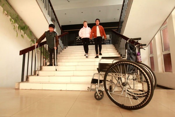 在新华的校园里,你时常能看到这样一个坐在轮椅上的小伙子。在通往教室、食堂、宿舍的路上,他自信而坚定地推着手下的车轮,朝着自己的目标走去。