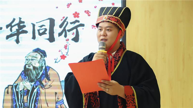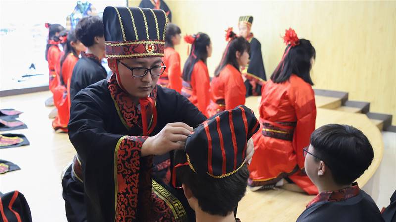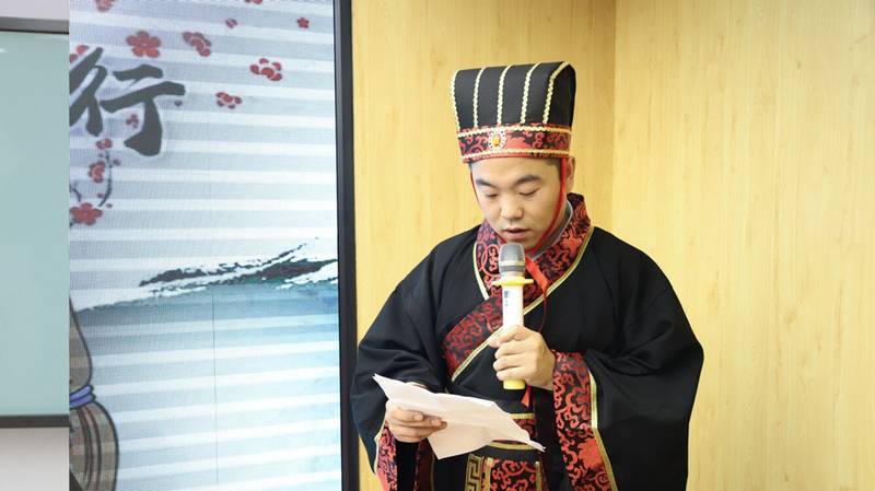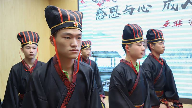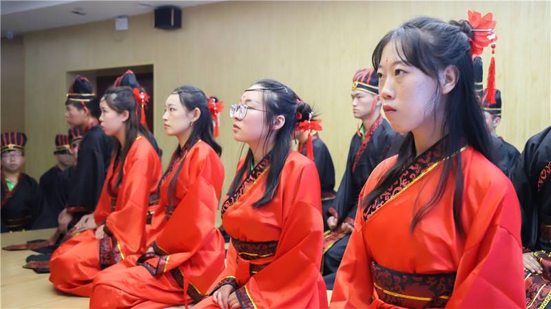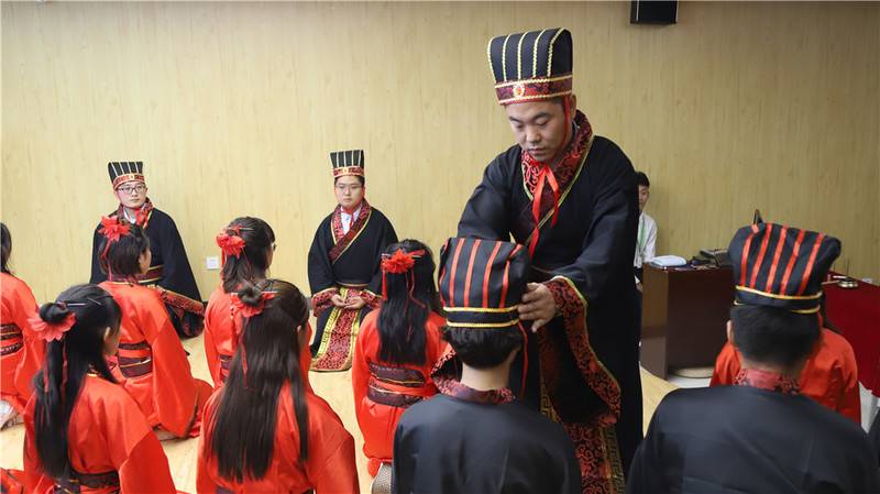 学子们身着红黑汉服有序入场,各位执事依次就位。在司仪的号令下,正宾入场、沃盥,正宾上香读祝,为男生加冠、女生笈笄;执事为受礼者着衣加服;而后正宾为受礼者敬醴酒;接着众人肃立礼尊,面向孔子与国旗站立作揖礼。较后学子受聆训。