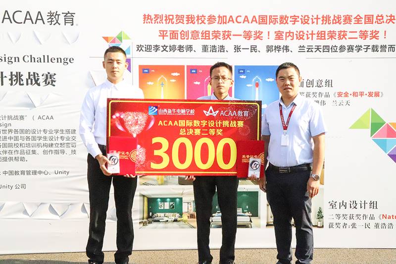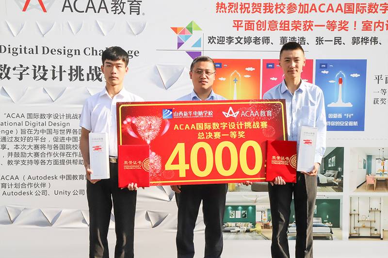 山西新华电脑学校设计类专业的郭桦伟、董浩浩等4名同学代表山西队出征西安,带队老师是学校VR环境艺术项目导师李文婷。郭桦伟、兰云天同学荣获ACAA 国际数字设计挑战赛全国总决赛平面创意设计项目一等奖,董浩浩、张一民同学荣获ACAA 国际数字设计挑战赛全国总决赛室内创意设计项目二等奖。