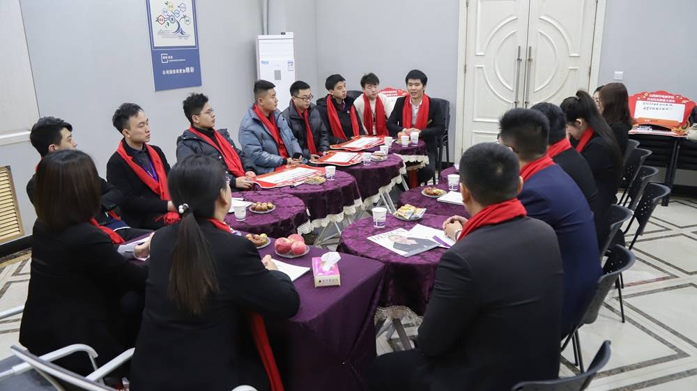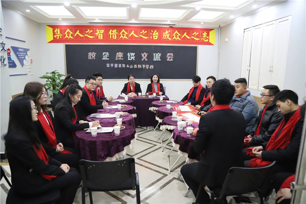 首站,学校领导走进了山西紫苹果装饰公司,受到了公司领导和在那里工作的毕业学子们的热烈欢迎。在紫苹果装饰公司精心准备的会议室里,学校领导与公司领导和毕业学子们进行亲切交流。