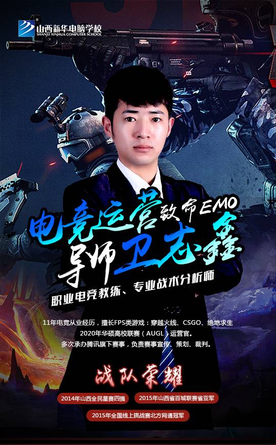 “致命EMO”本名卫志鑫,与08年那个全民谈体育谈竞技的年代,进入FPS电竞圈。拥有11年FPS电竞相关从业经历;在从事选手身份当中一直以队长身份带队进行线下与线上的比赛进行;承办赛事中会承当赛事宣传,赛事策划以及赛事裁判身份;个人取得荣誉无数:2012年晋城0356wan杯季军; 2014年山西全民星赛四强;2015年TGA桂冠挑战赛8强; 2015年全国线上挑战赛北方网通桂冠; 2015年山西省百城联赛省亚军等。
