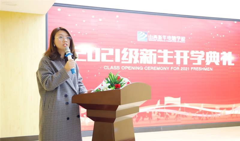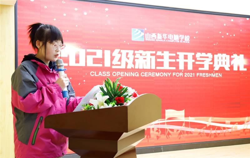 新生代表在讲台上发表了讲话,在山西新华的校园里,有可敬的老师,有团结友爱、尊师重道的同学,有科技前沿、设备先进的技能学习平台,能在这样的环境中学习,是每个山西新华学子的骄傲。学习是一个循序渐进的过程,这期间可能会有徘徊、会有阻碍,而学习技术的道路上困难与收获并存,但不管身处任何境地,我们都不要因一时的不适应而放弃自己,相信长风破浪会有时、直挂云帆济沧海。