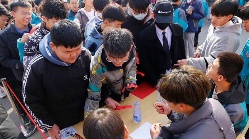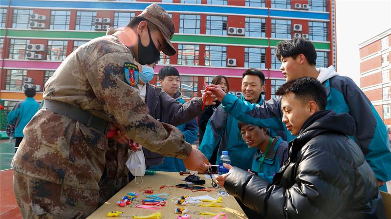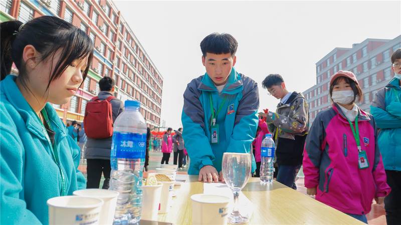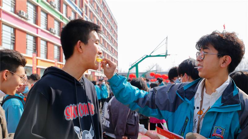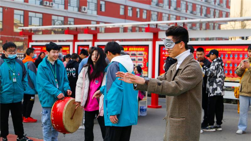 在学校爱国广场东侧的趣味运动游戏场地上,也围满了排队等待参加的学子们。学校为趣味运动游戏设置了许多精美的奖品,游戏项目有讲究平衡与技巧的夹乒乓球——“水中取珠”、考验手感精准度的飞镖射气球——“小李飞刀”、测试记忆力和力道控制的蒙眼穿障碍——“勇闯雷区”,还有幸运大转盘抽奖活动等等,不少幸运小伙伴们抽到了奖品,一脸喜悦地拍照留念。