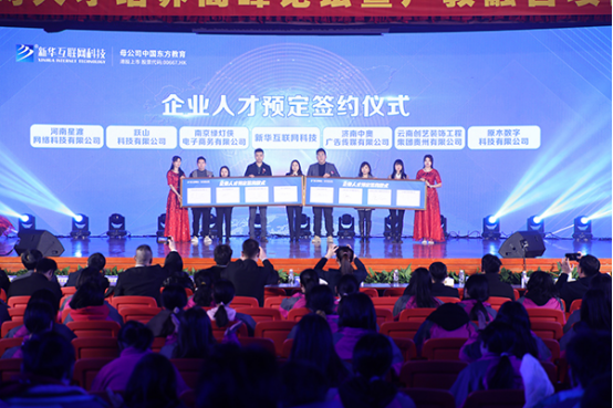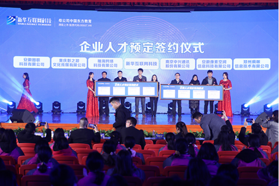 随后,中国东方教育集团创就业部部长助理丁艳红与安徽图联科技有限公司、重庆影之游文化传媒有限公司、柚淘网络科技有限公司等12家企业领导嘉宾一起上台签订人才预定协议,同时引进企业的真实项目。新华互联网科技利用真实项目实战为新华学子提供项目培训、技术支持、人才培养等多领域指导与合作。