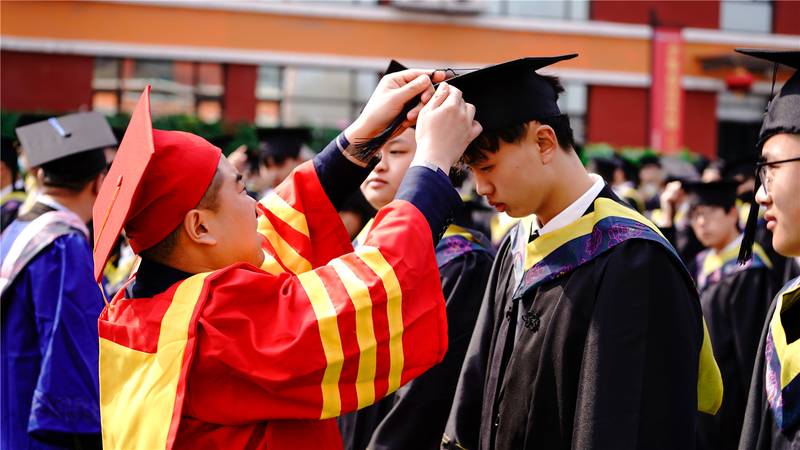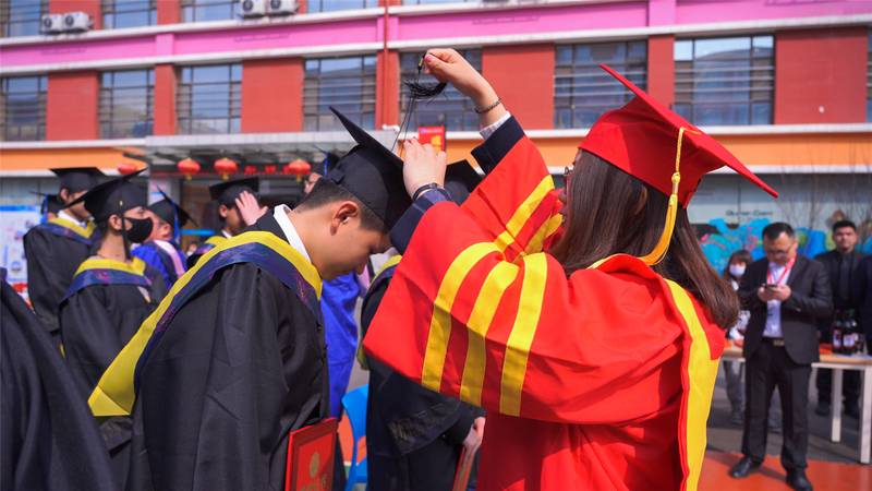 紧接着,典礼迎来较激动人心的环节——拨穗,为在山西新华校园里努力奋斗、学有所成的学子们“加冕”,这个仪式简单而又庄重。身着学士服的学生们在接受王助理和朱主任拨穗那一刻,曾经年少稚气的脸庞多了几分坚毅与成熟,他们将带着父母的期待、老师的嘱托、母校的期盼,踏上人生新的征程。