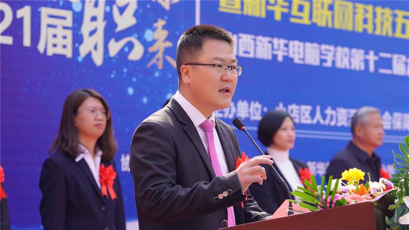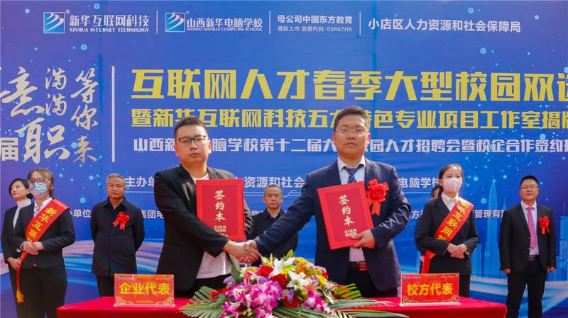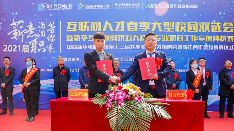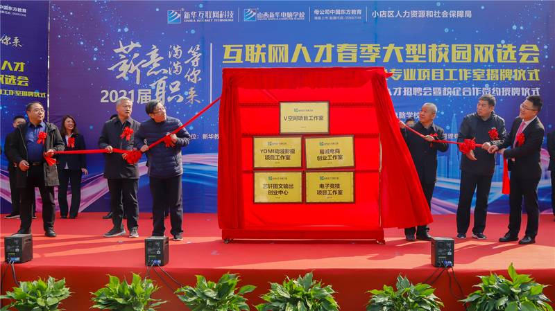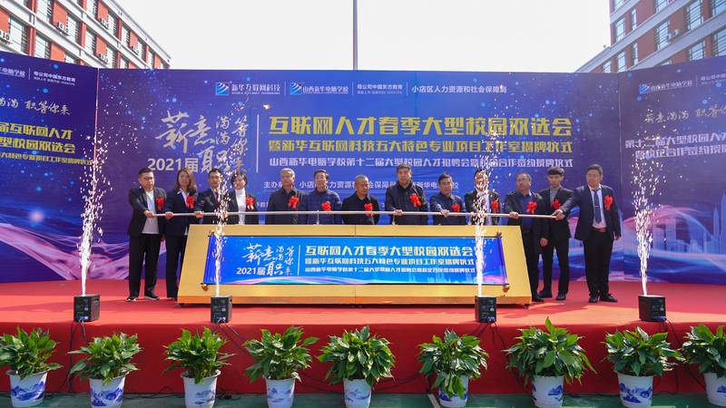 为全面贯彻落实山西省省委十一届十一次全会暨省委经济工作会议、市委十一届十次全会暨市委经济工作会议以及省市“两会”精神,坚持稳岗留工和输出就业并重,实现“更高质量和更充分就业”的目标,稳定省城就业形势,根据2021年太原市“稳岗留工 输出就业”招聘季活动,2021年3月11日,由小店区人力资源和社会保障局和山西新华电脑学校联合主办的2021届互联网人才春季大型毕业生校园双选会暨新华互联网科技五大特色专业项目工作室揭牌仪式在山西新华电脑学校隆重举行。全国各地的名企HR来到山西新华电脑学校招揽英才,山西黄河电视台等多家新闻媒体出席了开幕式并进行全程跟踪报道。