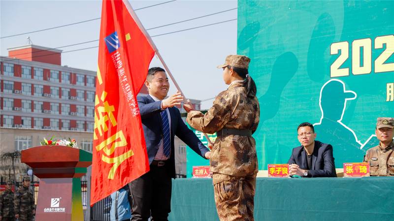 声声呐喊,磨练铁血意志;虎虎生风,彰显硬汉风骨。随着教官们从朱主任手中接起学校锦旗与学生连队连旗,本次2021级春季新生军事素质拓展训练正式启动。