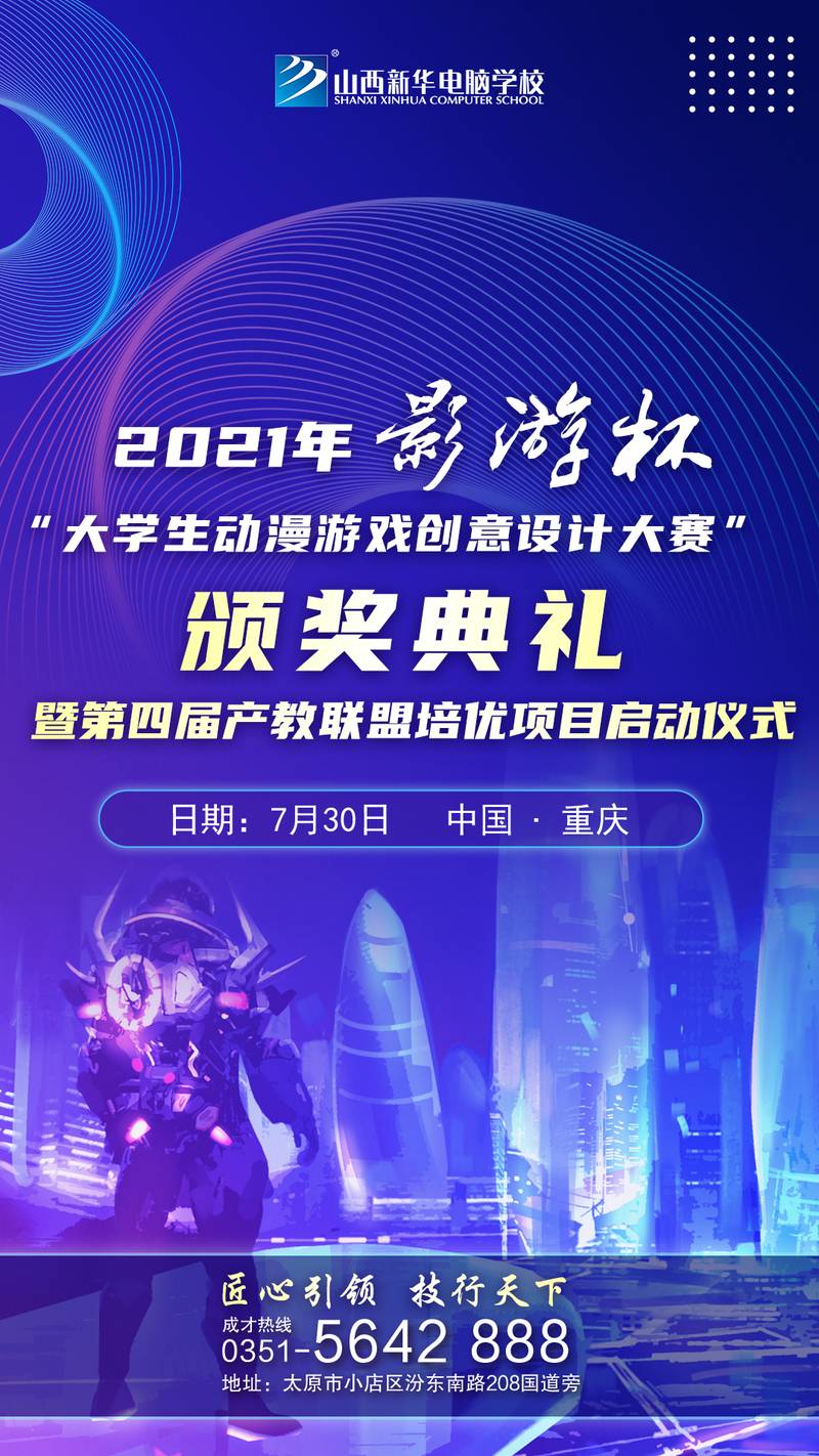 匠心引领·技行天下2021年 “影游杯”大学生动漫游戏创意设计大赛颁奖典礼暨第四届产教联盟培优项目启动仪式将于7月30日盛大开启。本次大赛是由影游网络与新华教育集团主办,重庆新华电脑学校承办,纽约电影学院中国预科中心、成都影游、成都混沌艺创科技、重庆影游、匠韵网络、广州禾于文石、深圳游正网络、浙江云抖传媒等企业支持。