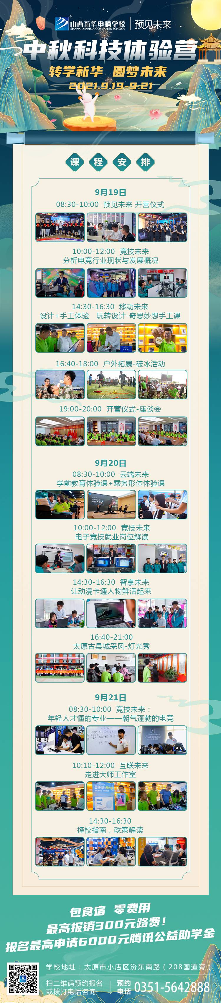 山西新华电脑学校作为专业的互联网院校,办学多年来累计为社会培养诸多专业的IT应用型人才,通过实训和实战作为主要的教学手段,对学生进行全素质教育,职业素养的培训,不仅培养青年的IT专业技能,更为社会培养一批的有志青年。中秋体验营期间,学校除了体验营参与的活动外,还有其他惊喜!这样的假期你还在考虑什么?“中秋”山西新华电脑学校走起!小伙伴们不见不散哦!