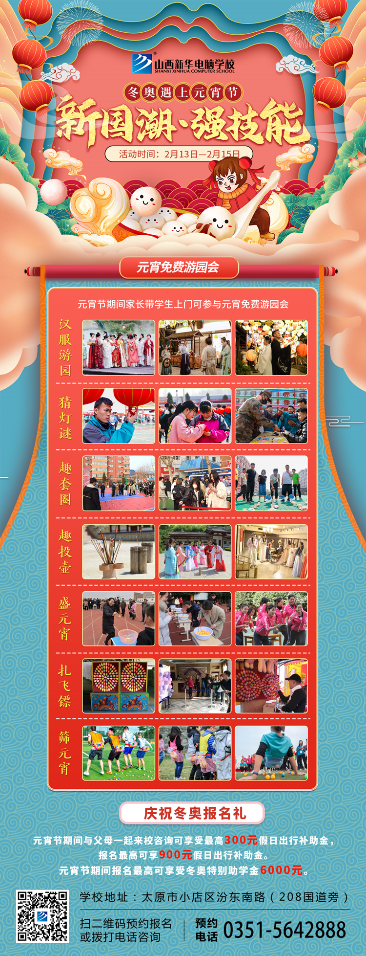 元宵节是中国传统节日之一,元宵节即将到来,同时正当同学们返校开始新学期的时候,为了让同学们以崭新的面貌迎接新学期,更深入地渲染校园文化氛围,我校将于2月13日(正月十三)—2月15日(正月十五)举行“新国潮.强技能”元宵节游园会活动。诚邀山西新华全校师生及想要择校的广大学生家长一起感受传统习俗,共度佳节。