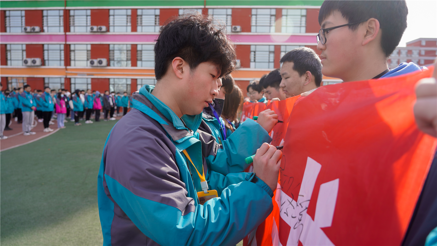 一个学校的学生具有良好的文明行为习惯,才能构建出优良的学习环境,创设出优良的学习气氛。现在,新华学子正处于人生中较关键的成长时期,他们在这个时期的所作所为,将潜移默化的影响到自身的心理素质,而文明的行为就在帮助他们提高自身的心理素质,同时也完善了自身的道德品质。各个班级在班主任的带领下,所有学生依次有序上台在签名条幅留下自己的名字,当他们将自己的名字挥挥洒洒地书写在条幅上时,他们就是这个学校文明礼貌较形象的代言人。