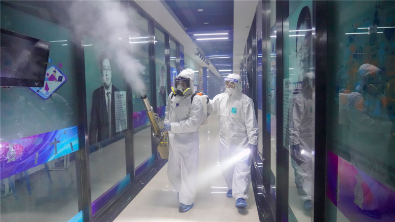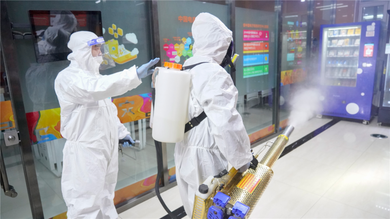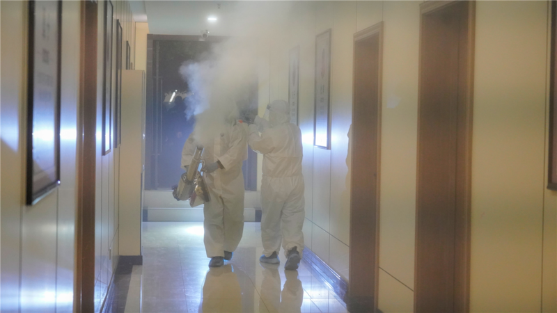 消毒人员身穿防护服,手持喷雾器,严格按照规定程序,采用“地毯式”的消杀方式,对教室、实训中心、楼梯、楼道、厕所、垃圾桶以及公共区域进行了全面细致的消杀。消毒过程中,消毒人员严格按照消毒剂使用说明配比、防疫物资佩戴齐全,闭窗消杀待半小时后通风擦拭,本着专业负责的态度不放过任何一个死角,确保消毒彻底,不遗漏任何一个角落,让病毒细菌无处藏身。