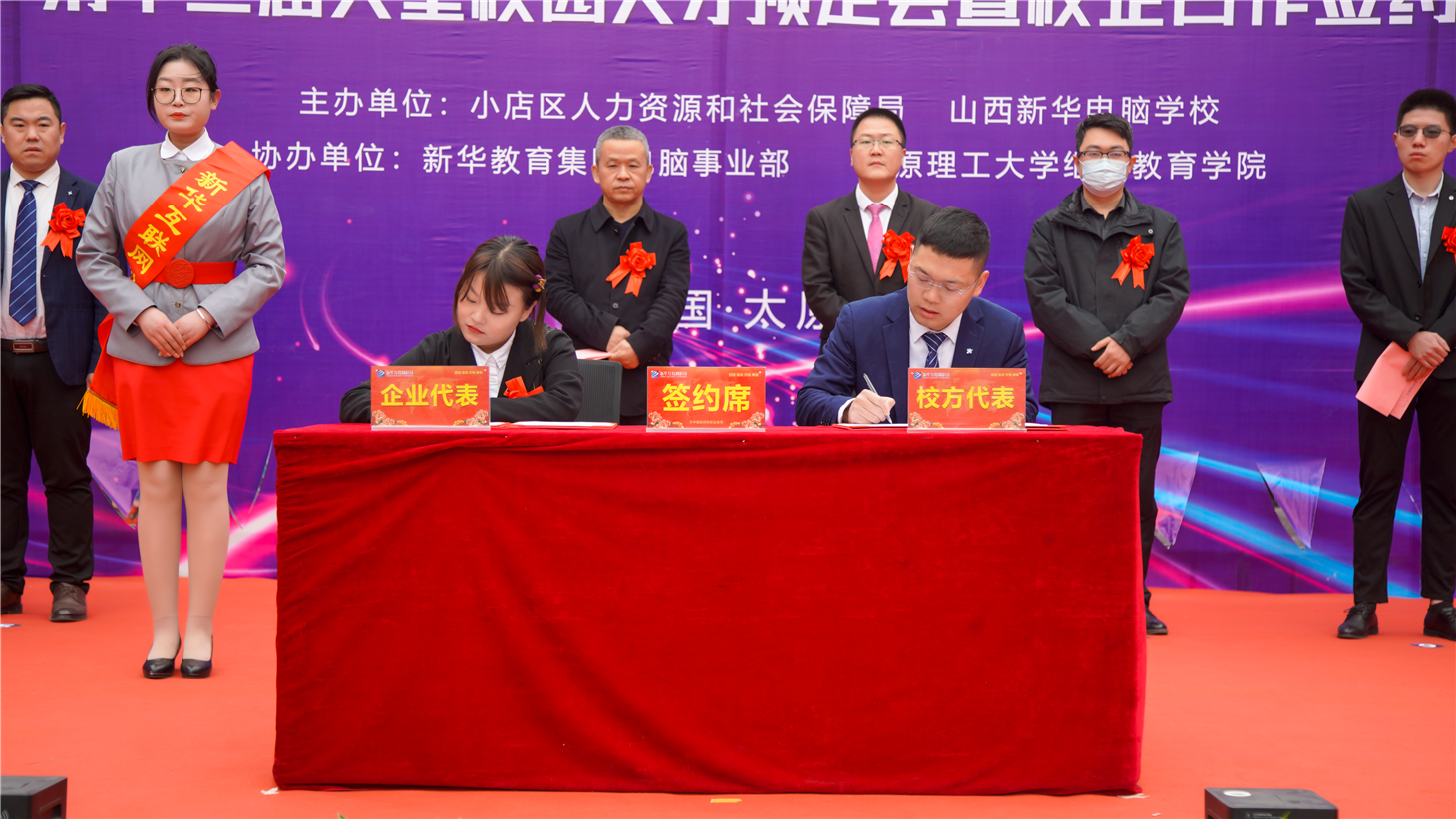 太原市小店区人力资源和社会保障局局长尚红宝、小店区人力资源和社会保障局公共就业服务中心主任温哲、山西新华电脑学校校长王家贤、柏首设计装饰工程有限公司总经理赵海超、河北冀铁旅服校企合作事业部经理权风杰、山西新华电脑学校校区主任朱前杰等领导及嘉宾共同出席了此次盛会。