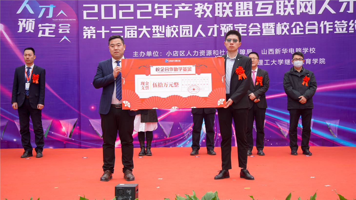企业代表发言中,河北冀铁旅服校企合作事业部经理权风杰对此次校企合作的发展前景和规划给予了肯定,他指出:“随着互联网行业开发建设驶入“快车道”,校企之间的合作将更加广泛和深入。山西新华电脑学校技术实力强劲、学术氛围浓厚、专业优势突出,互联网行业优势明显、发展前景美好,双方要充分发挥各自优势特色,进一步在专业技术人才培养、环艺设计攻关成果应用等方面取得新的突破。”为激励学子们努力学习,权风杰经理还代表合作企业为山西新华赠与校企合作助学金50万元,朱前杰主任代表学校接受了此次校企培养基金捐助。