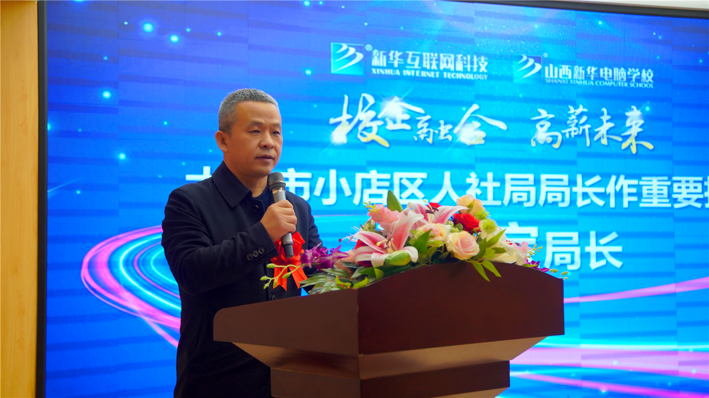 太原市小店区人社局尚红宝局长发表重要讲话。他对山西新华高技能人才培养、就业安置等各方面工作给予了充分认可。他也表示,大学生就业创业基地与太原市小店区高技能人才培养基地授牌仪式活动的举办,标志着小店区人社局与山西新华建立了正式合作关系,为区域高技能人才培养和年轻的大学生们提供了一个良好的实习、创业、就业平台,必将推进区域高技能人才培养和大学生高质量就业再上新台阶。