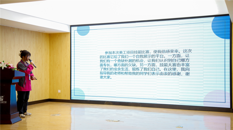 美工设计是一种感受、一种心态、一种舒适的、开心的生活方式。本次参与技能大赛的同学,用自己所学成果,倾注于设计的作品中,并以高台演讲的形式去表达自己的作品。可能会有瑕疵和不足,但这正是将来学习的方向,只要勇敢的表达了,就是很大的成就。他们分别展示了设计效果图,并详细阐述了设计风格、设计理念、设计思路,评委组老师对每一个学生的作品进行了细致的点评,在考察每位参赛同学的整体作品后,进行评分。