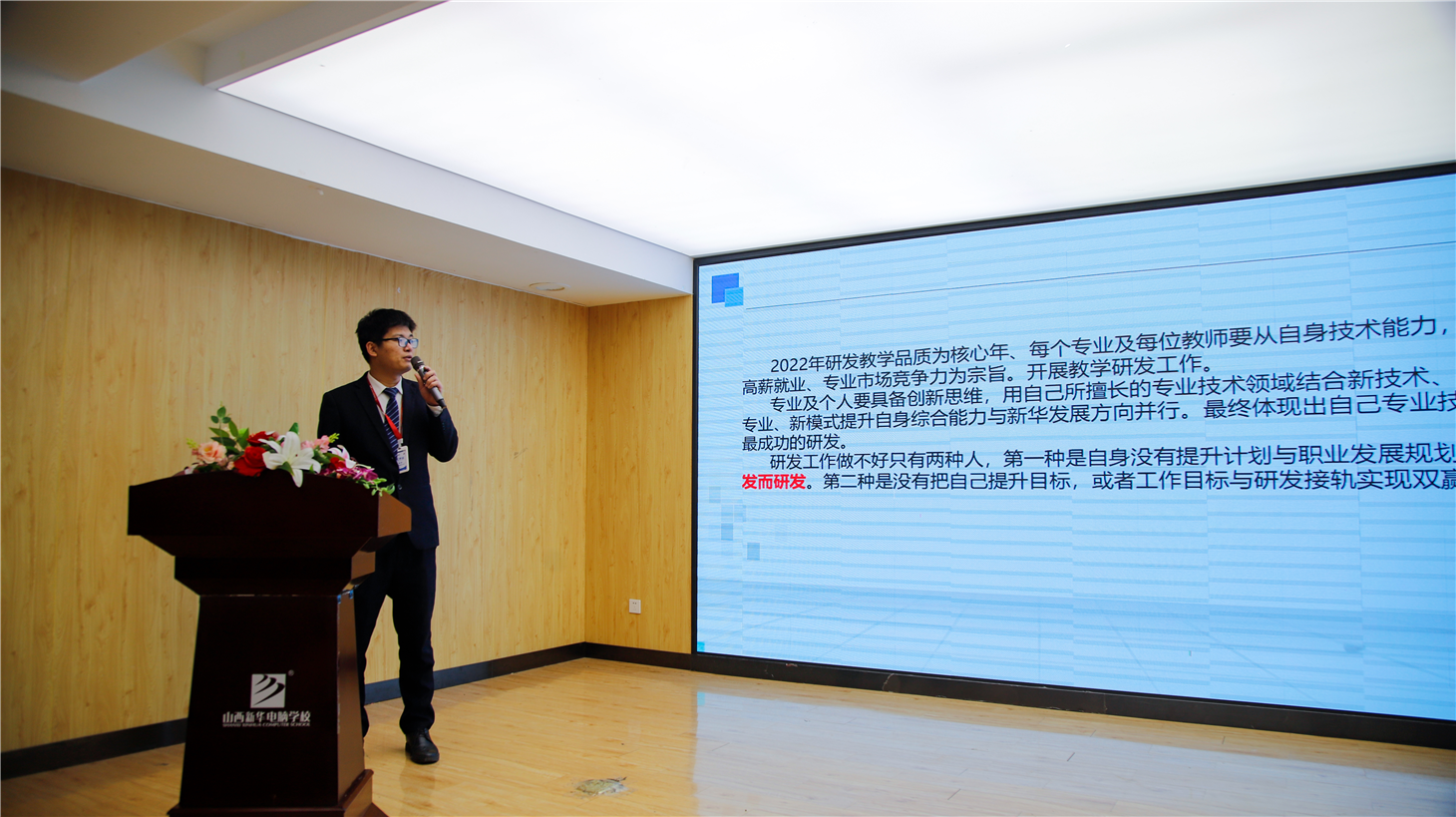 山西新华电脑学校校区主任朱主任对本次活动做了重要讲话,他表示本次教学研发立项任务合同签约,是为检验新华教学品质、在实践中提升老师教学能力。我校立志把教育教学工作做透彻、做到位、做扎实,让学子们学到的技能都能符合现代化市场的发展。希望学校研发团队能够不负期望,以孜孜以求的态度、以勇于创新的精神、以推陈出新的行动将我们的教学研发成果打造成学校一道亮丽的风景线,相信山西新华教学工作会百尺竿头更进一步,我们拭目以待!