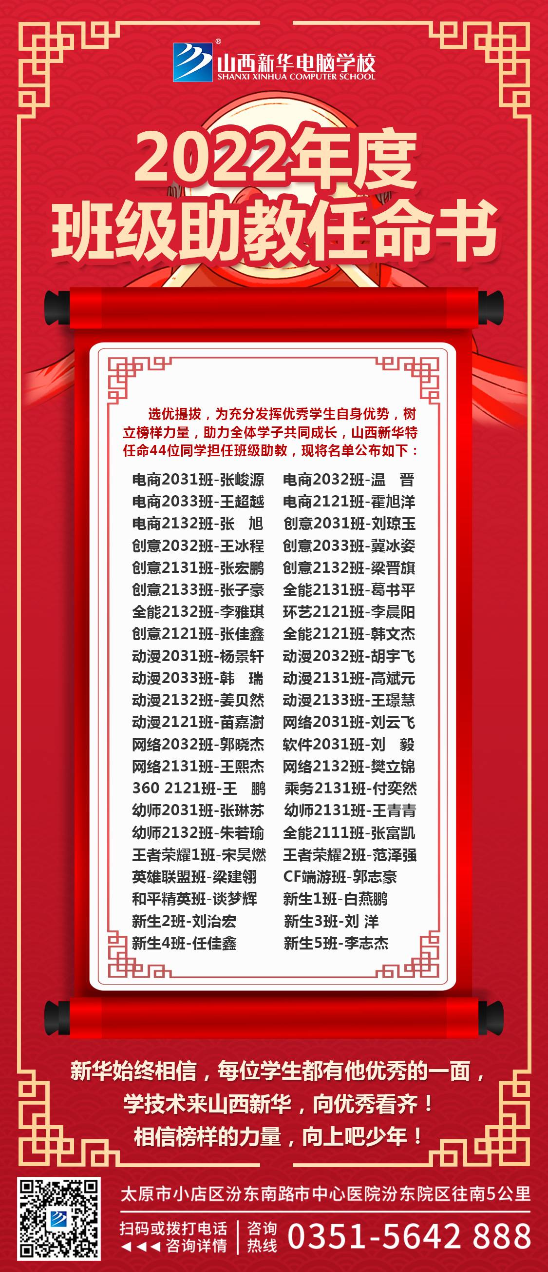 为充分发挥出色学生自身优势,树立榜样力量,增强学生在协助教师管理和育人方面的责任担当,发挥学生在教学建设中助学、助育的积极作用,促进学生能力的提升,为学校培养更多高质量人才贡献力量,山西新华电脑学校于2022年5月19日举行了2022年班级助教选拔聘任仪式,学校相关领导及全体师生参加了本次仪式。