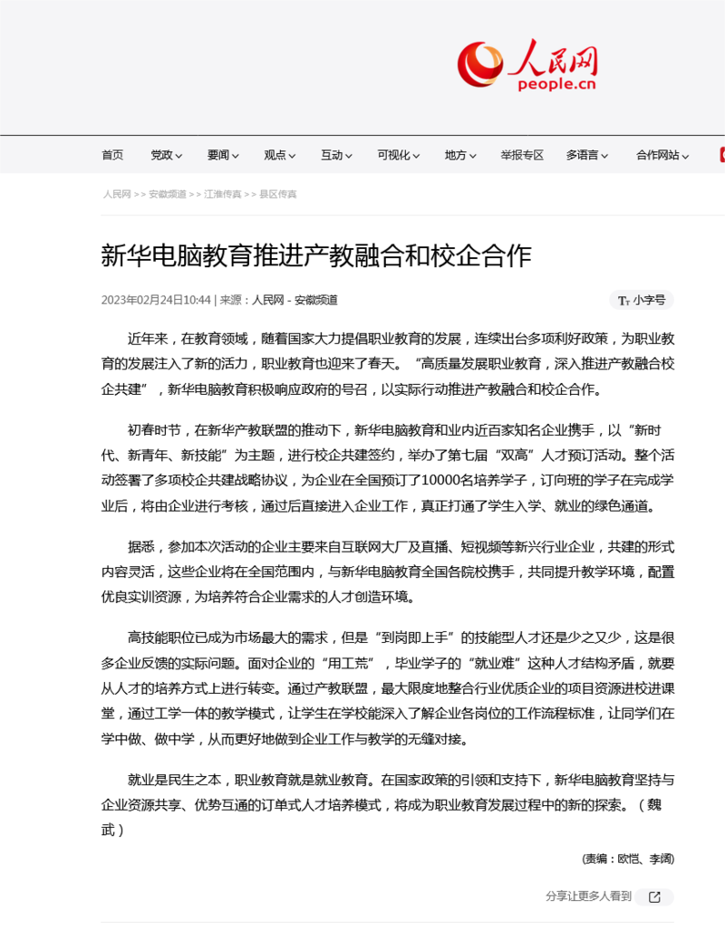 2月24日,人民网发文称赞“新华电脑教育推进产教融合和校企合作”,对新华电脑教育积极响应政府的号召,以实际行动推进产教融合和校企合作予以认可。