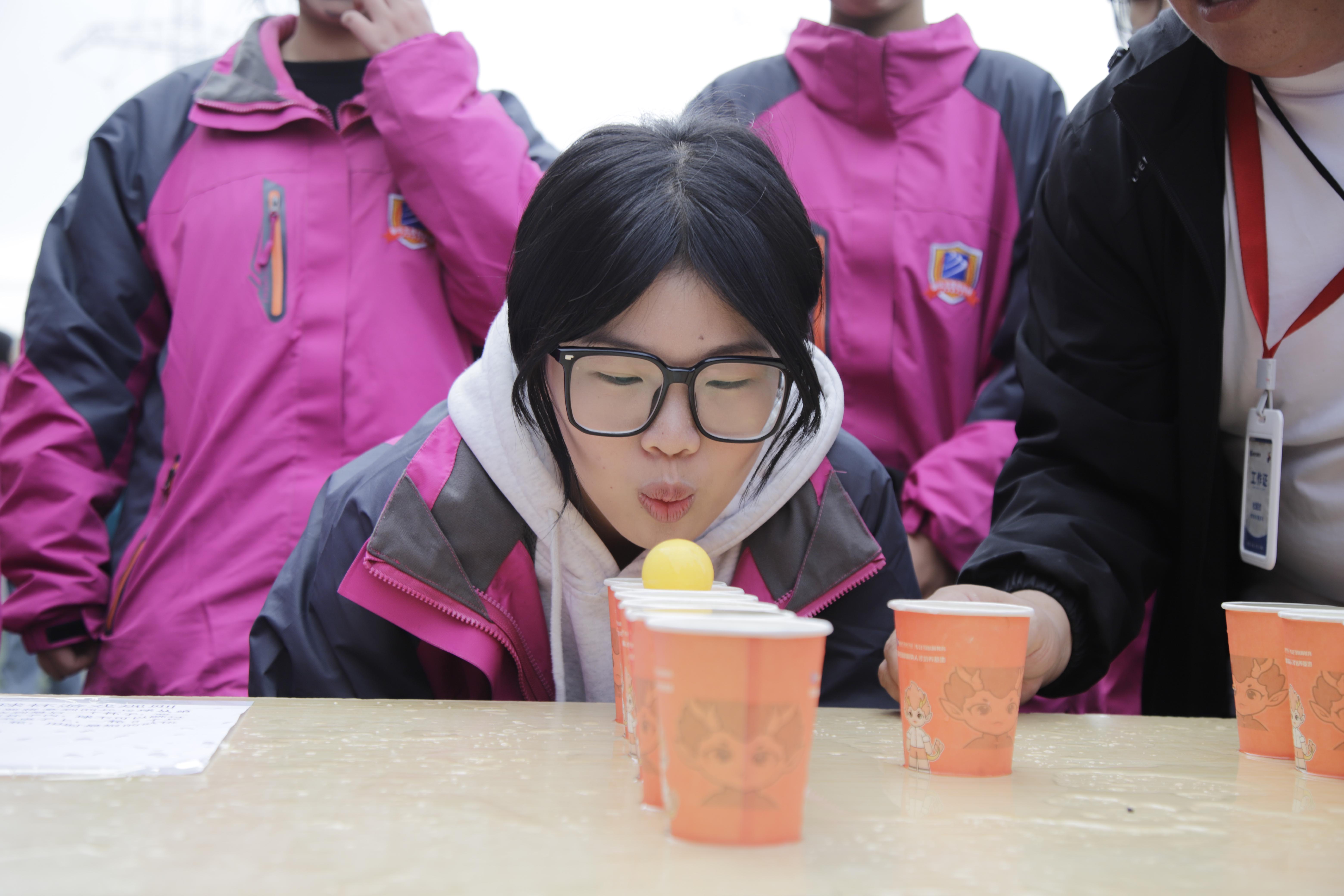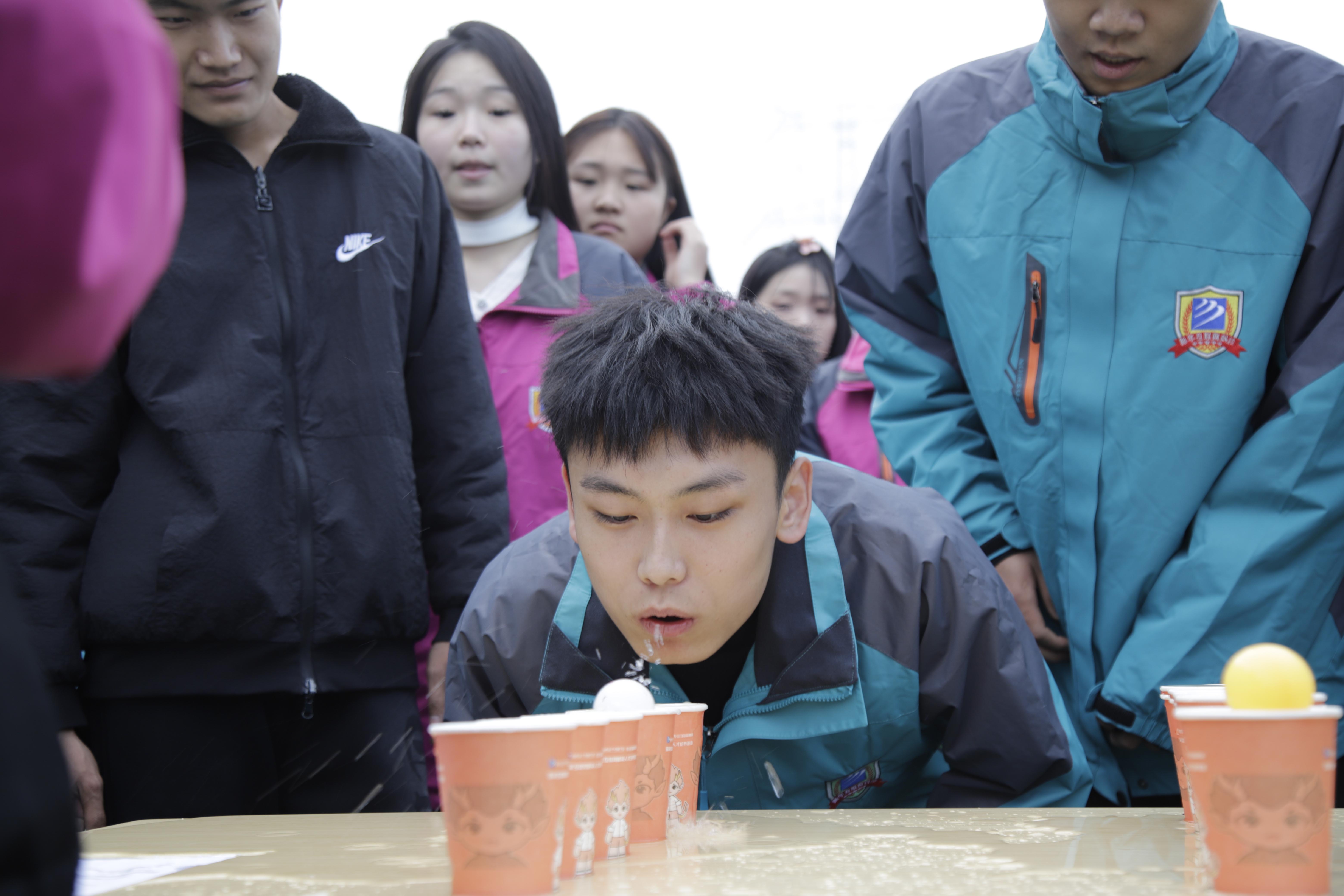 吹球落杯也是一项充满趣味的运动会项目。同学们需要用嘴巴把小球吹到杯中,由于力度难以把控,所以吹起来特别费劲。旁观的同学们看着参赛者一个个鼓起腮帮、瞪大眼睛的样子,都忍不住发笑。