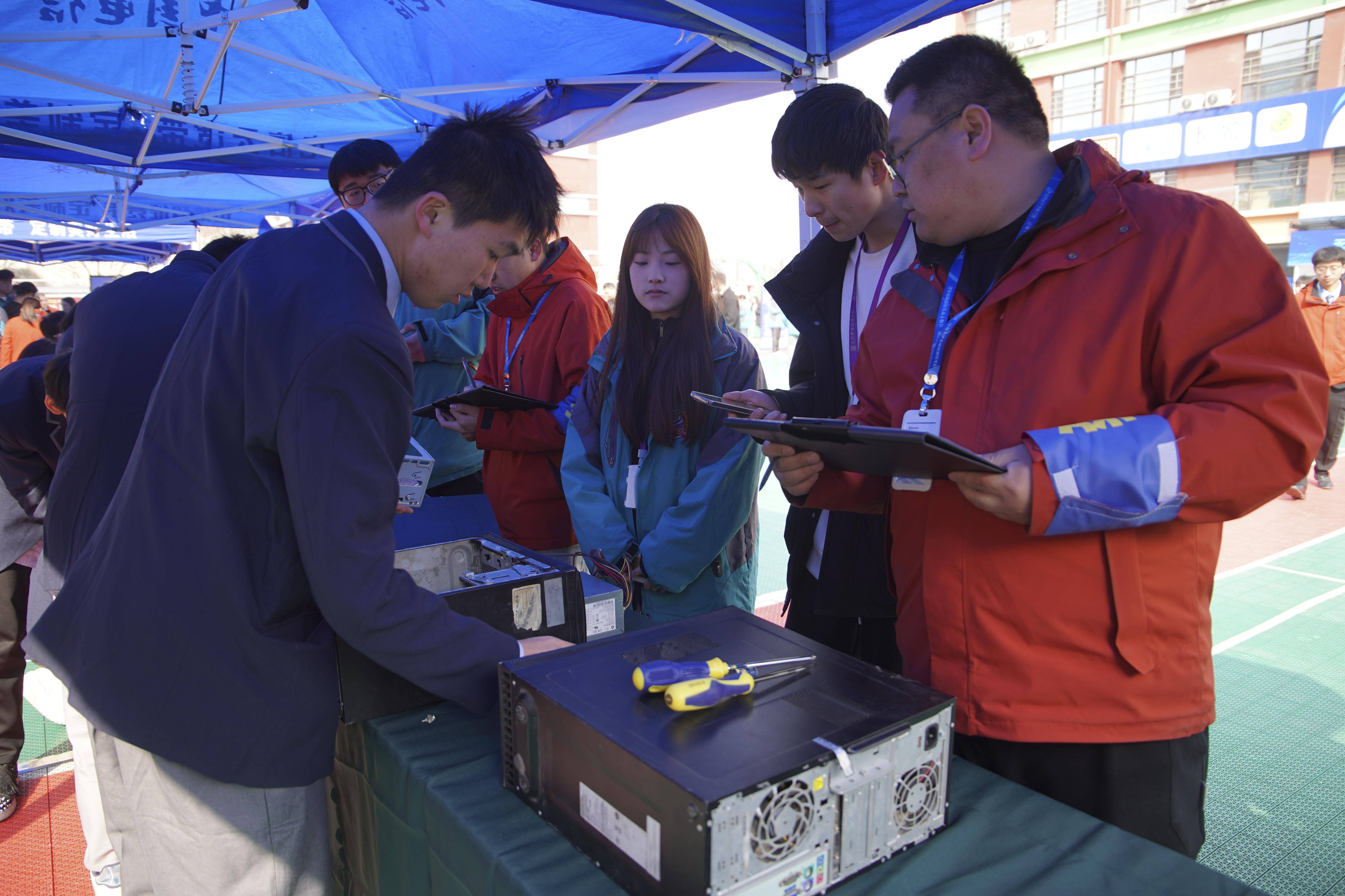 在计算机组装与维护技能挑战赛现场,参赛的同学们需在限定时间内完成整机组装、系统安装及故障排除。现场设置的互动体验区允许来访家长和同学亲手尝试组装电脑配件,直观感受技术操作的严谨性。一名初二学生兴奋地说:“原来主板上的每一个接口都有特定功能,组装时必须一丝不苟,这让我对计算机专业有了更深的兴趣。”