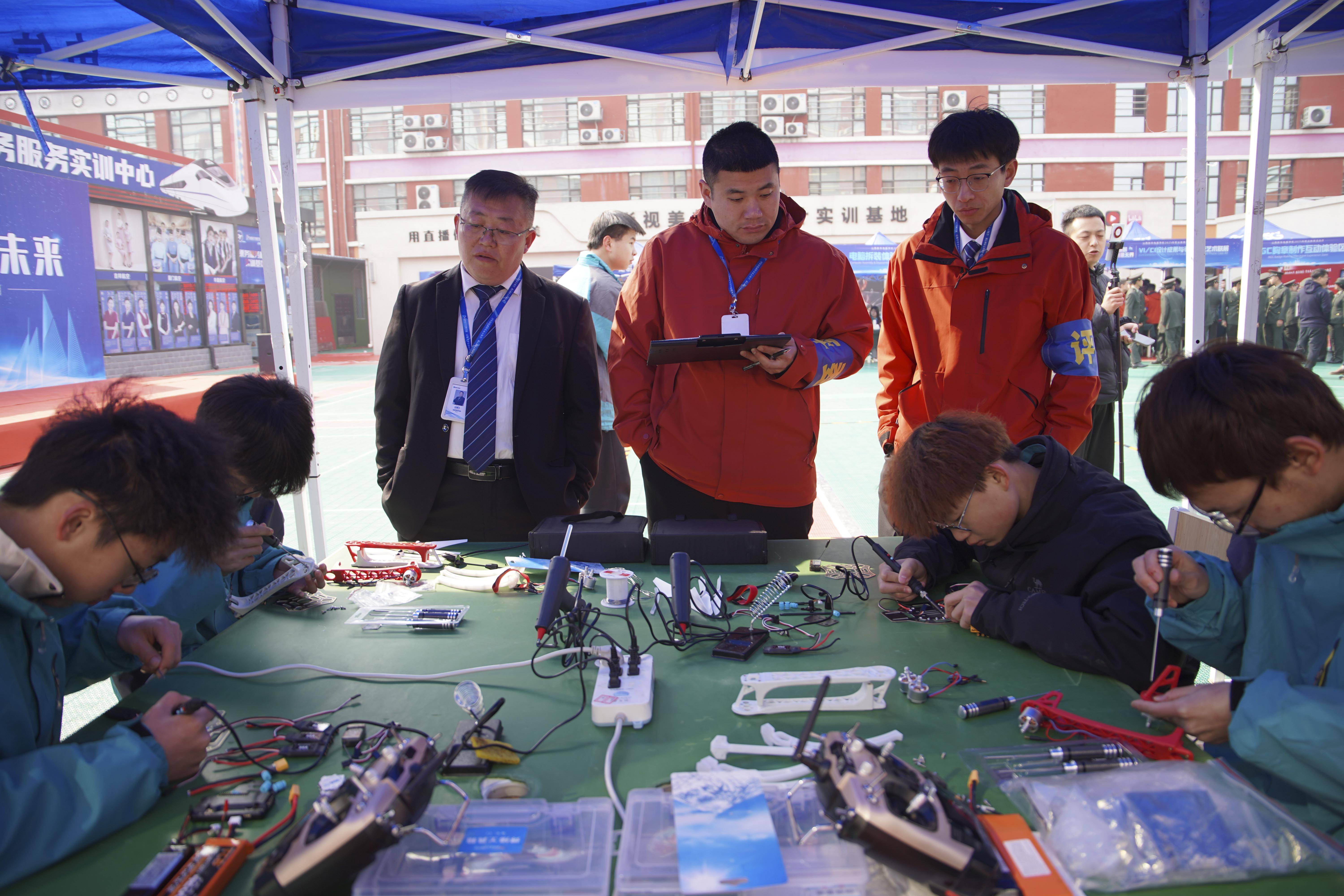 在无人机装调检修赛区,同学们手持电烙铁精准焊接电路板,用螺丝刀和万用表,快速完成故障诊断与零部件更换,通过编程调试让无人机在障碍赛道中灵巧穿梭。当一架红色无人机稳稳降落在指定区域时,现场爆发出热烈掌声。来着企业的裁判员表示:“这些学生已经掌握了多旋翼无人机的组装与维修技术,他们调试无人机的熟练度,已经达到我们公司初级工程师水平”。
